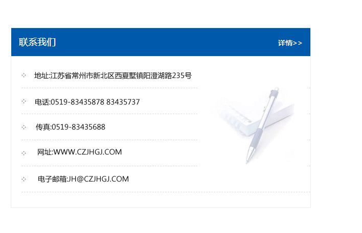 地址:常州市新北區友邦商務大廈1幢16、17層  電話:0519-85101652  傳真:0519-85112595  郵編:213022  網址:www.cz-jiayue_cn.mumeishow.com  郵箱:xiajifengaa@163.com
